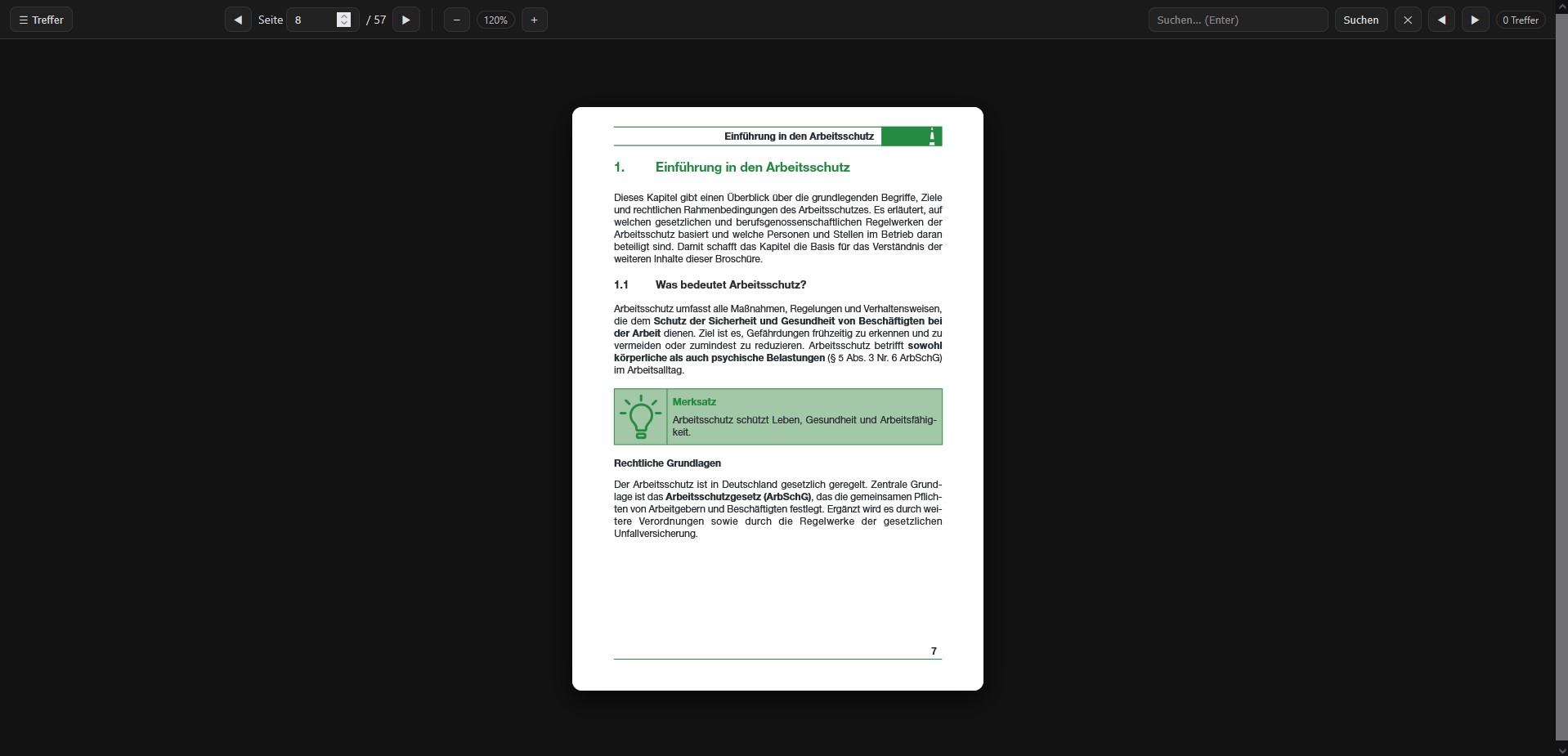 Diese Broschüre vermittelt die Grundlagen des Arbeitsschutzes in verständlicher und praxisnaher Form. Sie richtet sich an Beschäftigte aller Branchen und eignet sich insbesondere zur Unterstützung von Unterweisungen gemäß § 12 ArbSchG sowie zur eigenständigen Information. Der Aufbau führt von den Grundlagen und Zielen des Arbeitsschutzes über Rechte und Pflichten der Beschäftigten bis hin zu sicherem Verhalten im Arbeitsalltag sowie dem richtigen Vorgehen bei Unfällen und Notfällen. Übungsfragen mit Lösungen am Ende der Broschüre dienen der Wiederholung und Lernkontrolle.